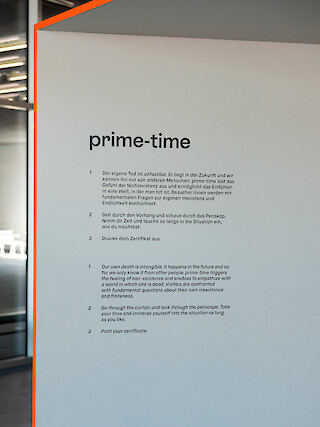 Der eigene Tod ist unfassbar. Er liegt in der Zukunft und bis jetzt kennen wir ihn nur von anderen Menschen. prime-time löst bei Besucher:innen das Gefühl der Nichtexistenz aus und ermöglicht das Einfühlen in eine Welt, in der man tot ist. Aus einem dunklen Raum heraus beobachten und belauschen Teilnehmer:innen einzeln eine öffentliche Situation, in der sie physisch nicht präsent sind. Eine zusätzliche Stimme konfrontiert Besucher:innen mit fundamentalen Fragen zur eigenen Inexistenz und Endlichkeit.