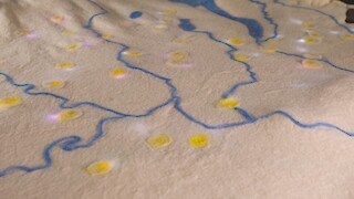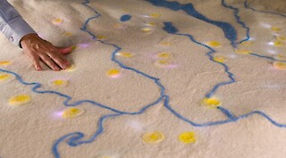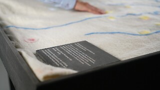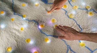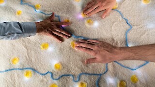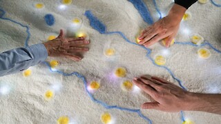 Dialect words can be felt in various places on the tablecloth, making the adaptability of dialect tangible. Only by using two touches at the right places can an explanation of the words be heard. This interaction with others and the tablecloth is intended to encourage dialogue about dialects and to spark curiosity about new influences on language.